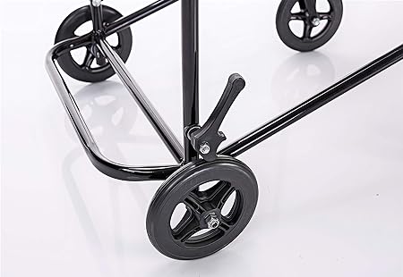 Rodas traseiras de 6" com pneu maciço giratórias, fixadas com porca travante (parlock) com garfo em aço carbono achatado e maciço com eixo vertical;
