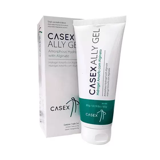 O curativo ally gel amorfo hidrogel com alginato 85gr Casex é um gel amorfo composto de alginato de cálcio e sódio, carboximetilcelulose de sódio, propilenoglicol e água deionizada. Apresenta a capacidade de hidratar feridas secas e também controlar o exsudato da ferida. Propicia um ambiente ideal para o tratamento das áreas necróticas de pouca ou nenhuma secreção.