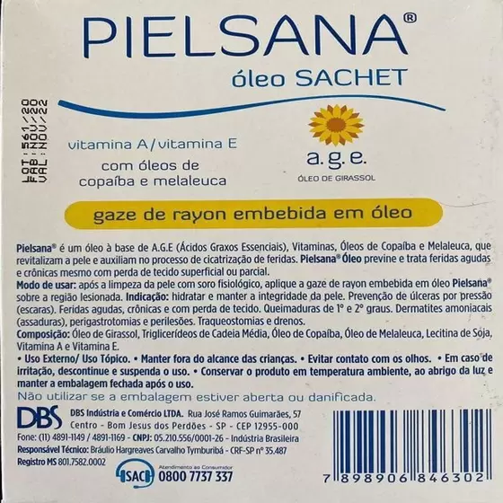 Pielsana® Sachet é uma gaze de rayon embebida em óleo a base de A.G.E (Ácidos Graxos Essenciais), T.C.M (Triglicerídeos de Cadeia Média), Vitaminas A e E, Óleos de Copaíba e Melaleuca, que previne e trata feridas agudas e crônicas, mesmo com perda de tecido superficial e total.