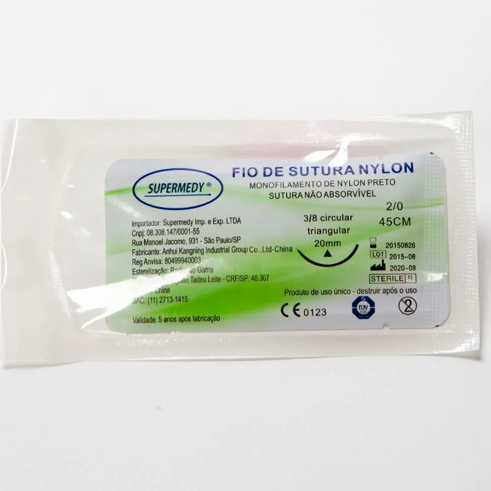 Descrição do Produto FIO Nylon Monofilamento Preto Supermrdy é uma sutura cirúrgica, conectada a uma agulha, que tem como função auxiliar em procedimentos cirúrgicos unindo os tecidos e penetrandoos com a mínima resistência, contendo agulha. Especificações Atóxico, nãopirogênico, de uso único. Embalados individualmente em Papel Grau Cirúrgicos, sendo que a embalagem primária tratase de envelope metalizado internamente, garantindo a integridade do fio. Possui resistência à tração e resistência ao nó As agulhas são inspecionadas individualmente quanto à ponta, lubrificação e fixação para garantir punção fácil e segura. Agulha: 20 mm (2.0 Cm) – 1/2 Círculo (Agulha – Aço inox). Tipo: Triangular. Estéril. Esterilizado por Raios Gama. Embalagem com 24 Vinte e quatro Unidades