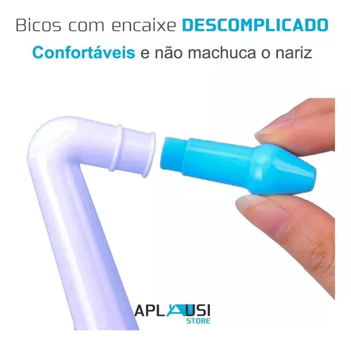 - Despeje soro fisiológico ou sal nasal no recipiente, porém pode ser água morna mesmo ( temperatura de mão ), depois escolha a ponteira adequada pada idade. Abra a boca, incline a cabeça para frente, coloque a ponteira no nariz e aperte o botão.