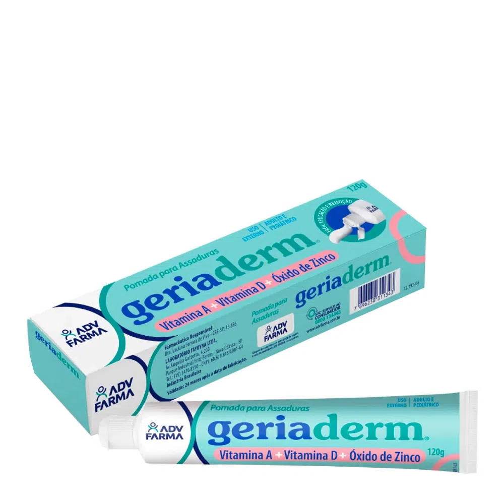 Foi cuidadosamente desenvolvida para cuidar da pele sensível de pessoas idosas que utilizam fralda geriátrica. Formulada com Vitamina A, Vitamina D e Óxido de Zinco , Geriaderm tem ação secativa, cicatrizante e é utilizada na prevenção e tratamento de assaduras e brotoejas. A versão em pomada forma uma camada que impede o contato da pele com as fezes e urina, evitando assaduras e irritações. Indicada para uso adulto e pediátrico.